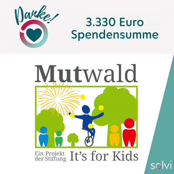Wir sagen Danke! Denn dank eurer Unterstützung konnte das Team solvi mit Kund:innen und Partner:innen 3.330 Euro für das Mutwald-Festival sammeln. Das ist großartig und wir freuen uns It's for Kids damit unterstützen zu können.