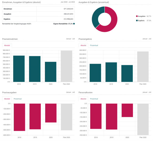 Die Entwicklung des Praxisergebnisses zusammen mit der Rentabilität zeigt, ob Sie sich im Plan befinden oder über Optimierungsstrategien nachdenken sollten.